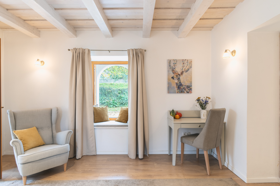 Tágas, romantikus hálószobánkból a terasz is közvetlenül megközelíthető, vendégeink madárcsicsergésre ébrednek. A kandalló meghitt hangulatot teremt, a tüzifát ingyenesen biztosítjuk.