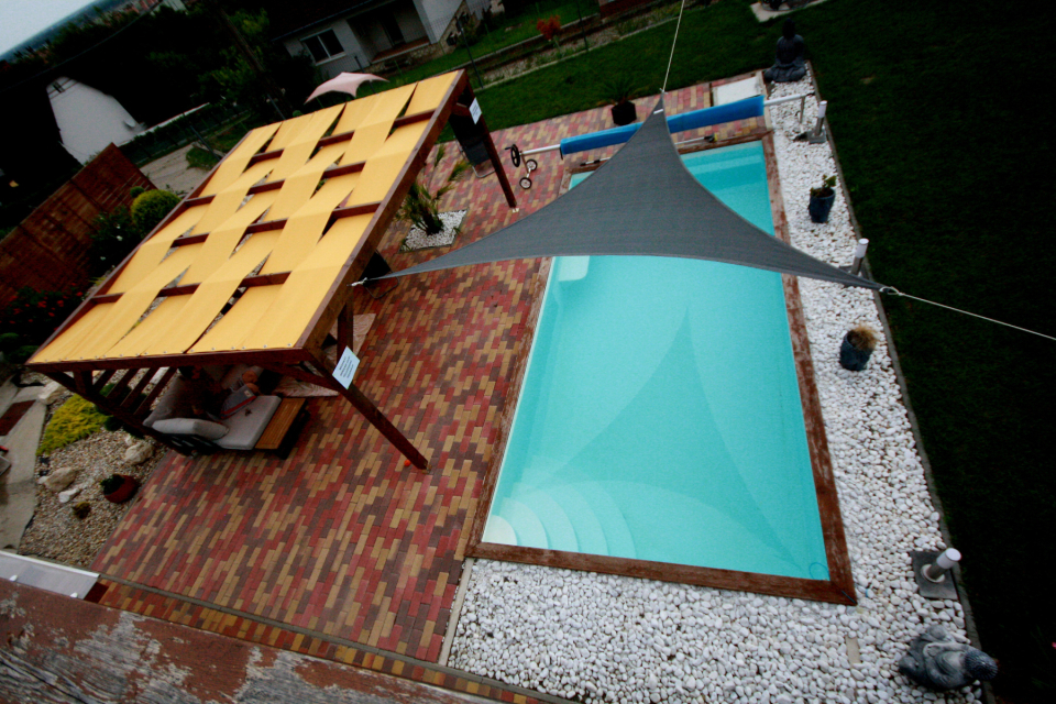 - Kültéri medence (szezonális, nem fűtött), nyáron van amikor 35-36 fokos, hiszen egész nap süti a nap, de árnyék is van, hisz egy napvitorla van kifeszítve fölé