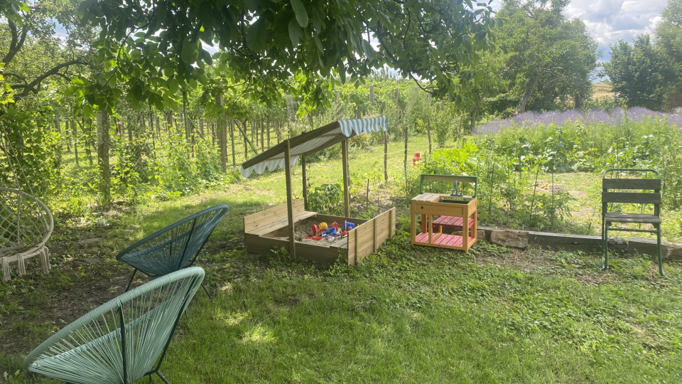 Az udvar teljesen körbekerített, elöl és oldalt fallal határolt, védett a kívácsi tekintetek elől. A hátsó kertben egy kis liget, kert, füves terület és egy levendulás található.