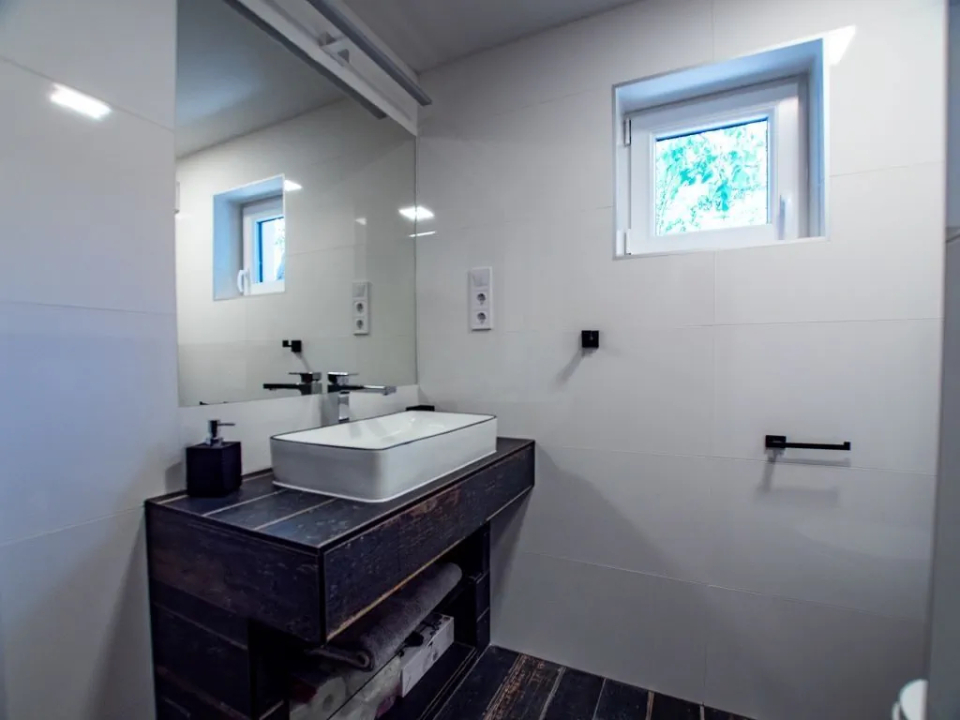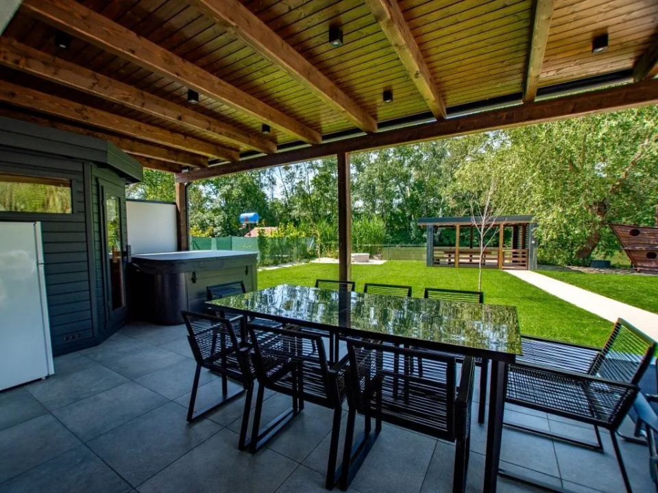 A nyaraló egy különálló kétágyas hálószoba és 2 kölünálló franciaágyas hálószobával és egy fürdőszoba zuhanyzóval és WC-vel, valamint egy különálló WC található várja vendégeit, így összesen hat fő számára biztosít ideális szállást. A teljesen felszerelt konyha, az étkező és a tágas nappali gyerekjátszósarokkal biztosítja a kényelmet és a szórakozást az egész család számára. A 32 négyzetméteres fedett teraszon egy öt férőhelyes jacuzzi és egy hatfős finn szauna található, amelyek a pihenést szolgálják. A nyaralóban biztosított az ivóvíz.