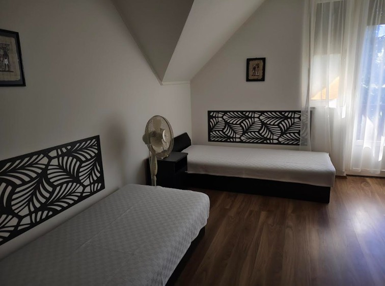 A földszinten található: a nappali ülőgarnitúrával, felszerelt konyhában villanytűzhely, hűtőszekrény, mikrohullámú sütő, kávéfőző és étkezősarok áll rendelkezésre. Itt van még egy kétágyas hálószoba. A fürdőszobában zuhanyzó és WC van. Az emeleten 3 db klimatizált, kétágyas szoba, melyek közül 2 szobához erkély is tartozik, fürdőszoba fürdőkáddal, mosógéppel és külön WC helyiséggel.