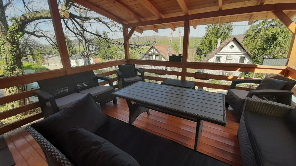 Nagy terasszal (16-18 m2) melyen kényelmes rattan garnitúra van, szép kilátással.