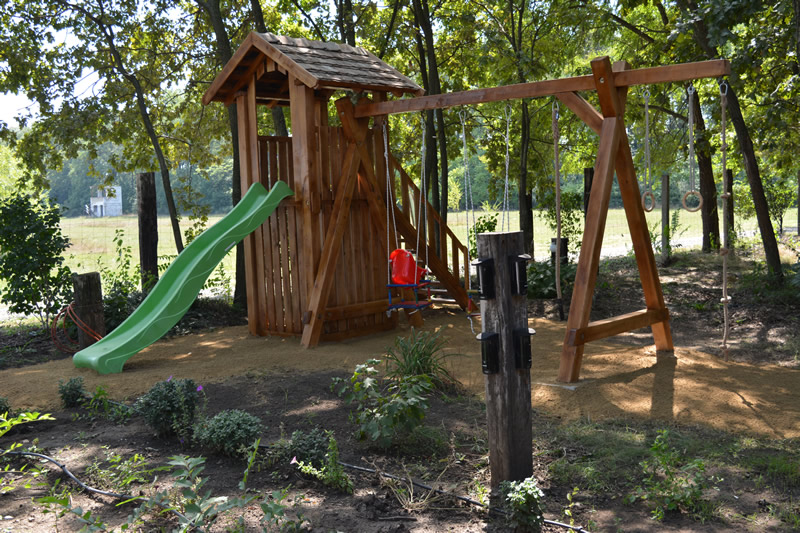 A ház előtt fedett és nyitott teraszok vannak kialakítva, ezektől pár méterre található a grillezésre, bográcsozásra alkalmas tűzhely. Az árnyas, napos, öntözött pázsitos, parkosított, virágos kertben fedett hintaágy. A kerttel határos tölgy-szíl erdő friss lehelete mindig jó levegőt biztosít az itt pihenők számára. A ház közvetlen környezetében elterülő ősgyepen nagy sétákat lehet tenni, gyönyörködni a közelben legelő juhnyájban. Az udvarban 4 autó parkolhat.