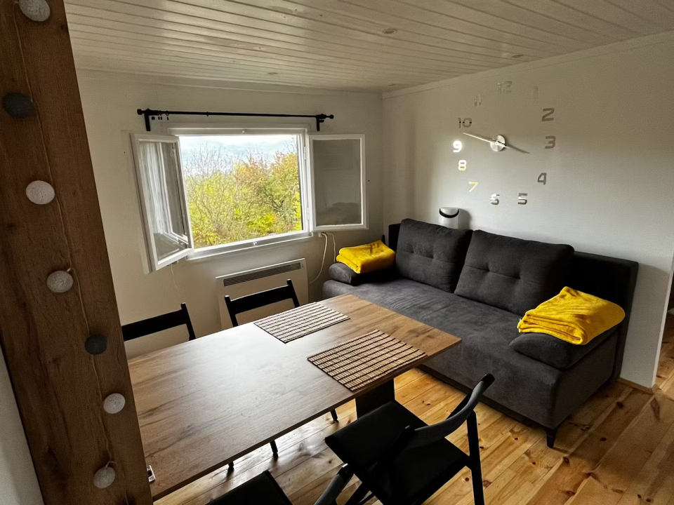 Teljeskörűen felújított 30 nm-es faház, melyben 2+2 főt tudunk fogadni. A ház amerikai konyhás nappaliból (teljes értékű 2 fős kanapéággyal) és egy franciaágyas hálószobából áll. A zuhanykabinos fürdőszoba a hálóból nyílik. Mindkét szoba teljes panorámás a Visegrádi várra es a Dunára.